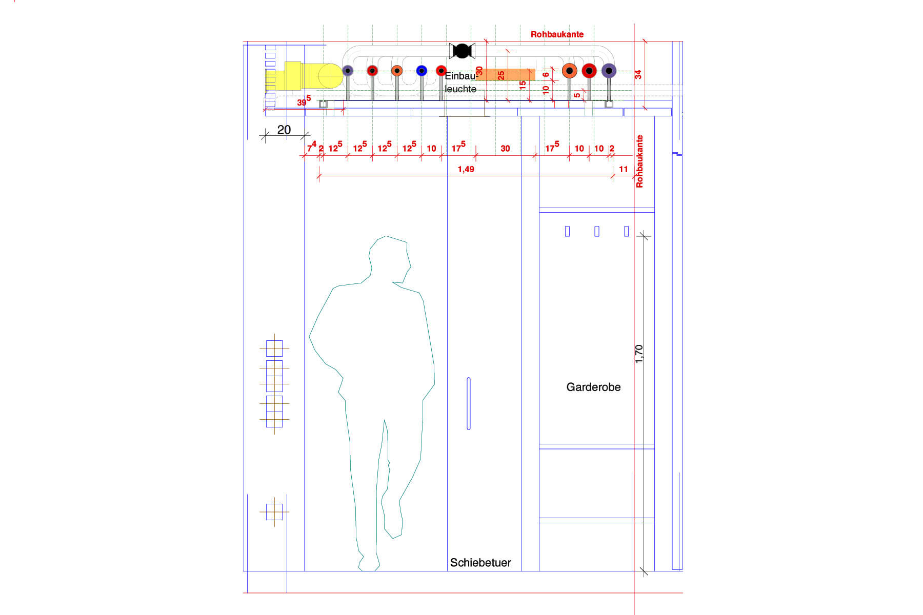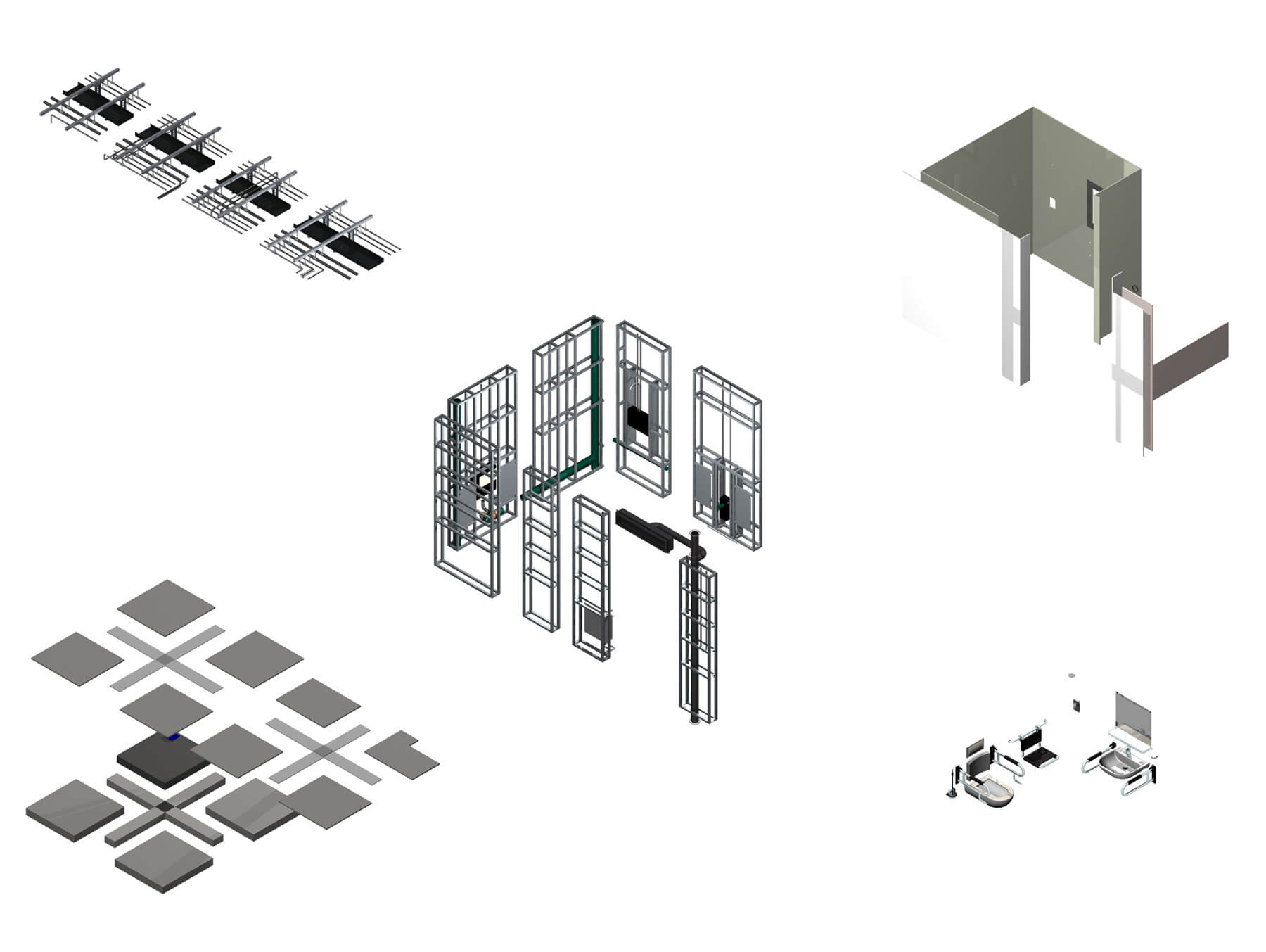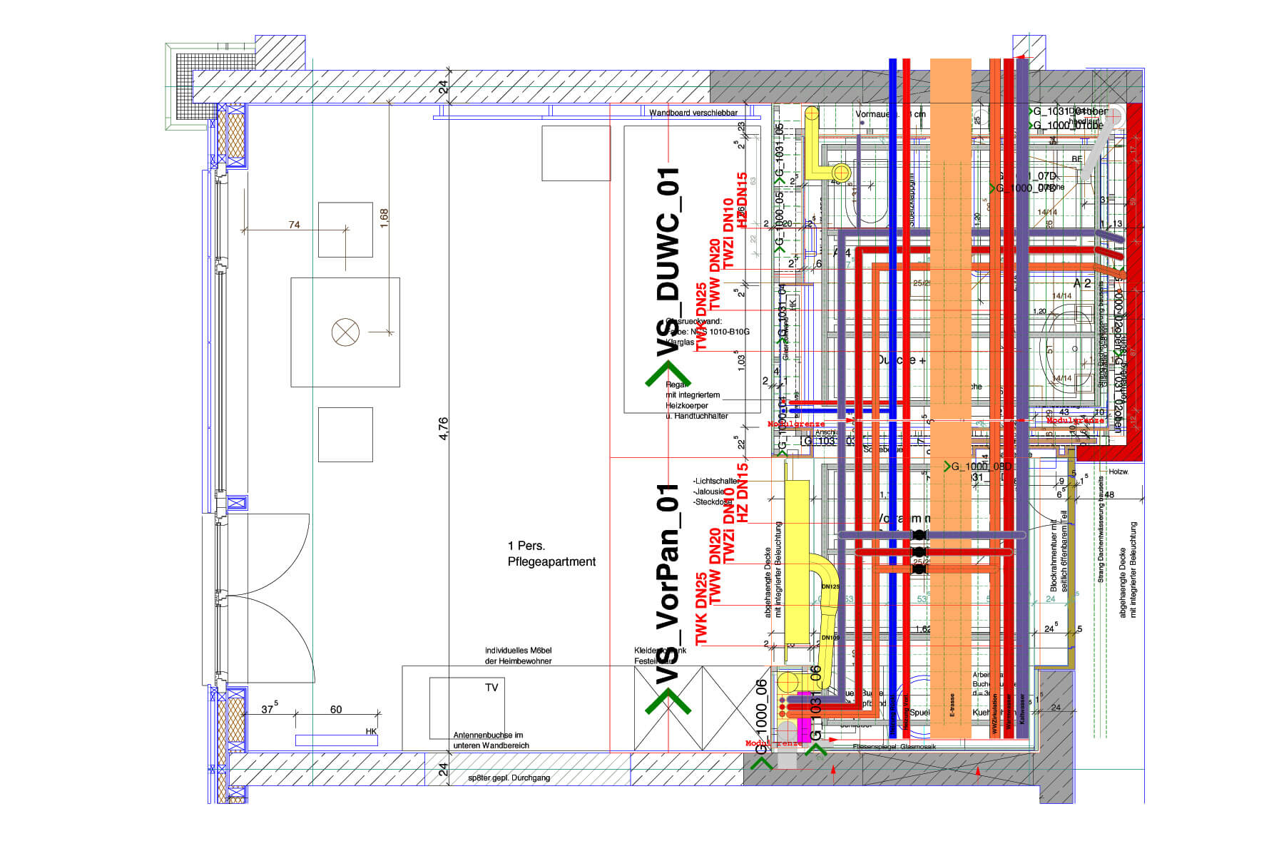 Im Projekt wurde im Auftrag der ausführenden Haustechnikfirma die gesamte Installationsführung ab Zentrale gebündelt und in vorgefertigten modularen Installationseinheiten zusammengefasst. Die Detaillierung der Module umfasste dabei neben den Medien Wasser, Abwasser, Lüftung und Heizung, die Elektroinstallation mit Einsatz von Kabelbäumen und standardisierten Stecksystemen (Regelungstechnik für Lüftung, Notrufsysteme etc.) sowie die Verkleidung und Möblierung.