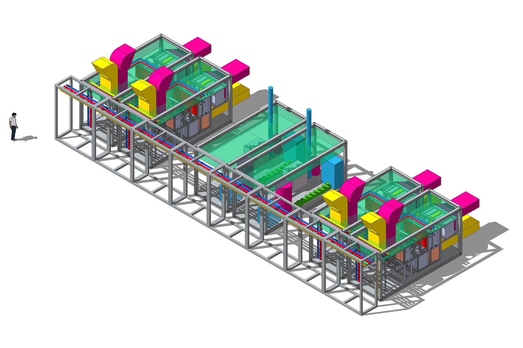 Standard Container als modulares Versorgungssystem (Heizung, Kühlung, Lüftung) für parametrische Produktionshallen