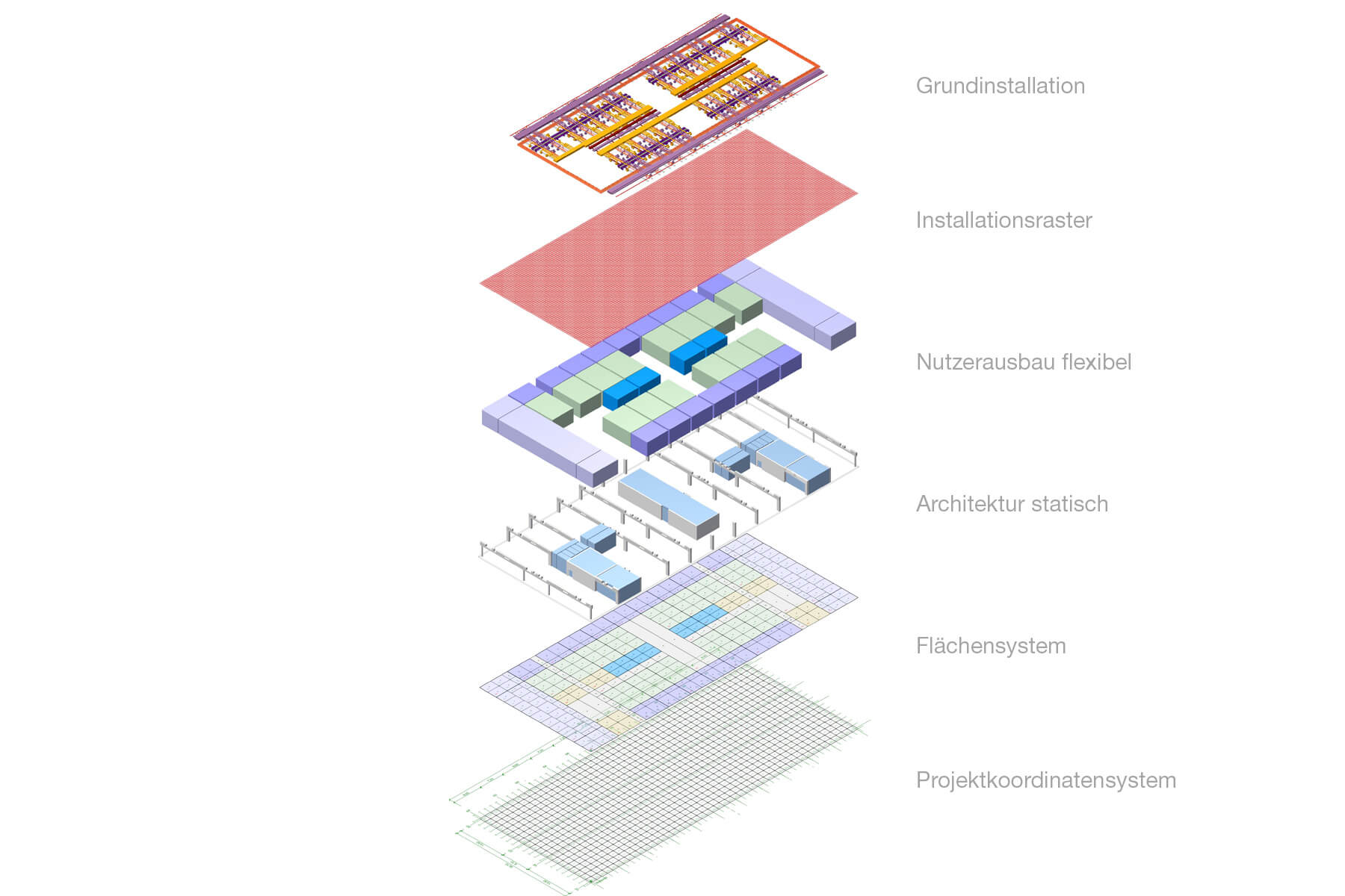 Der Planungsumfang im Projekt variiert über die verschiedenen Planungsphasen. In den CD (Concept Design) und BD (Basic Design) wurde unter dem Entwurfsaspekt „Bauen für den zweiten Nutzer“ sowohl als Gebäudemodell (Architektur, Tragwerk) in allen Facetten, als auch die Integration aller haustechnischen Gewerke erbracht. Aus diesem Anspruch heraus wurde der Entwurfsprozess bewusst von innen nach außen gestaltet wobei hierbei folgende Kriterien im Vordergrund standen: